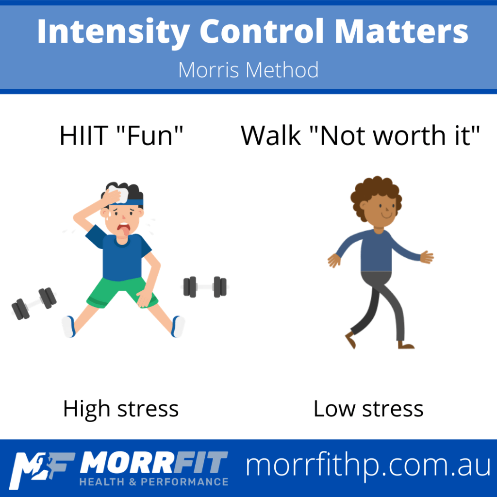 One of the failures of the fitness industry is the chronically high promotion of high intensity training for these goals and this type of person. Just take a stroll down to your local gym and check out all the classes on offer. Majority of the classes are hyped up sessions aiming to “get you going”. It sounds like it makes sense right…the harder you go the shorter the time you need. The harder and more frequent you go the more results you will get……