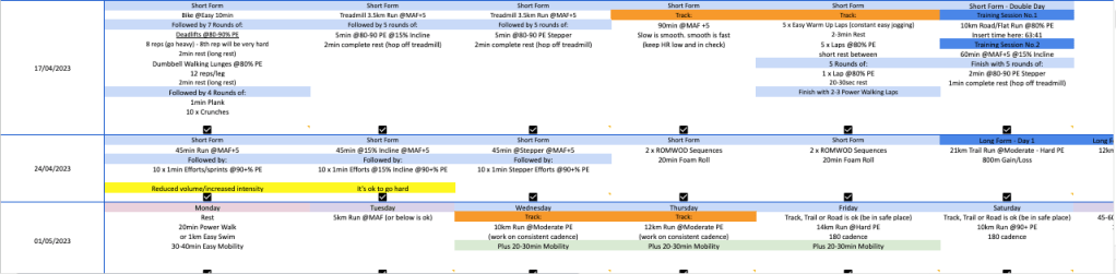 Cathy has been training with me for over 2 years now and she has built a very descent aerobic base over this time. Like all of us, we go in and out of peak moments of fitness and stages where maintenance can also be the goal. Cathy’s training specifically for UTA 50km started in January this year 2023.